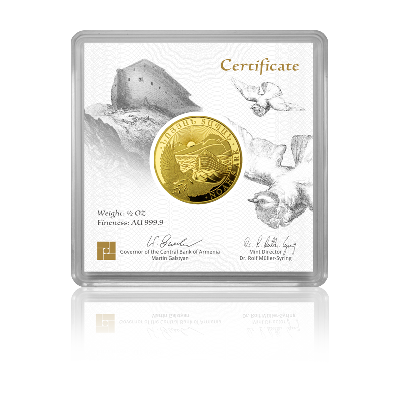 Die Edelmetallmünzen Arche Noah werden von der Zentralbank der Republik Armenien herausgegeben. Als gesetzliche Zahlungsmittel in Armenien unterliegt die Herstellung den strengen Auflagen der Zentralbank: Reinheit des Edelmetalls, Gewicht und Qualität der Prägung werden staatlich geprüft und garantiert. Die Gold-Anlagemünze wird aus reinstem Gold (999,9/1000) hergestellt.
