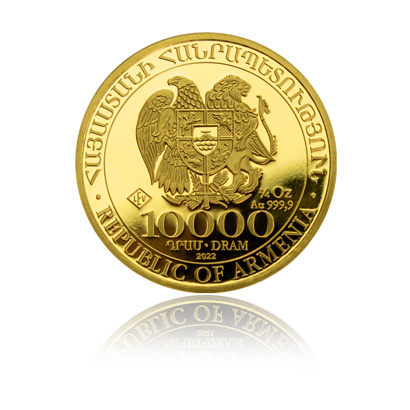 Die Vorderseite dieser exklusiven Münzedition zeigt das Wappen der Republik Armenien. Unterhalb findet sich der Nominalwert in armenischen Dram, das Feingewicht, die Reinheit, sowie das Prägejahr und das Symbol der Prägestätte.
