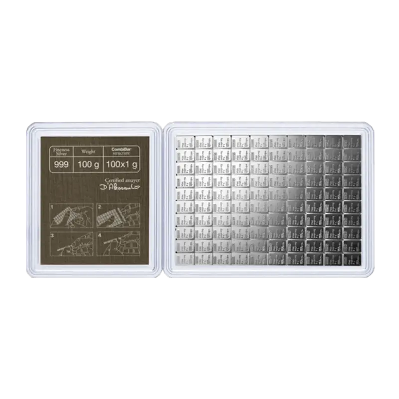 Der 100g Combi Barren besteht aus reinem Feinsilber (999,0/1000). Seine spezielle Prägung mit Sollbruchstellen erlaubt es, dass man einzelne 1g Barren abtrennen kann.
