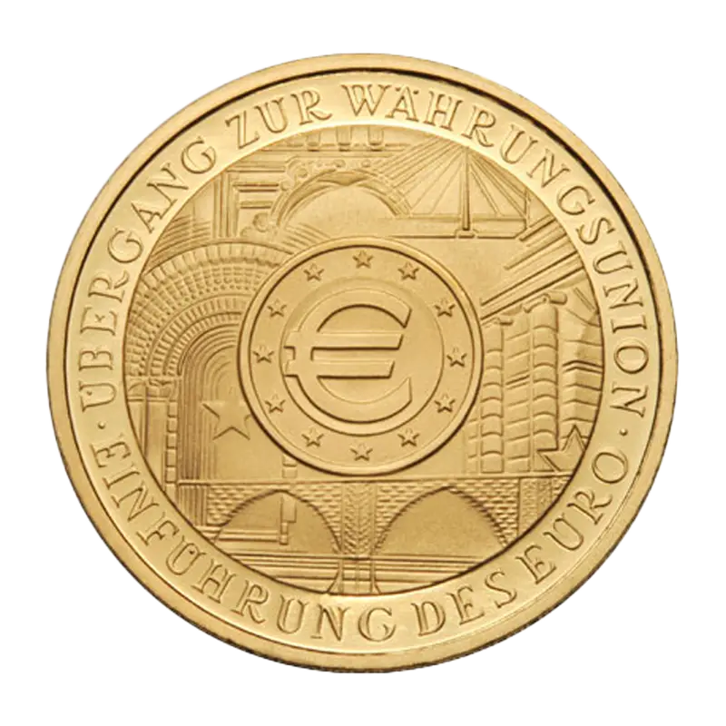 Die 100 Euro Goldmünze Übergang zur Währungsunion - Einführung des Euro wird einzeln gekapselt in der Original Münzschatulle mit Echtheitszertifikat der Deutschen Bundesbank geliefert.