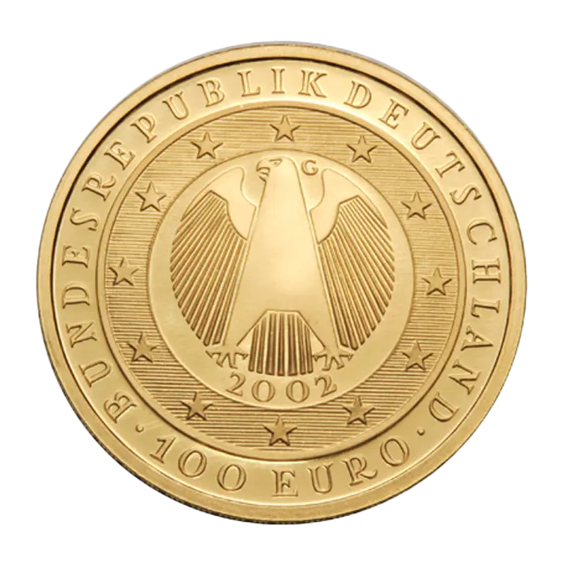 Der Entwurf der Bildseite dieser 100 Euro Münze stammt von dem Neuberger Künstler Anton Zvone Jesovsek und macht die Verbindung Deutschlands zu der neuen Währung deutlich.