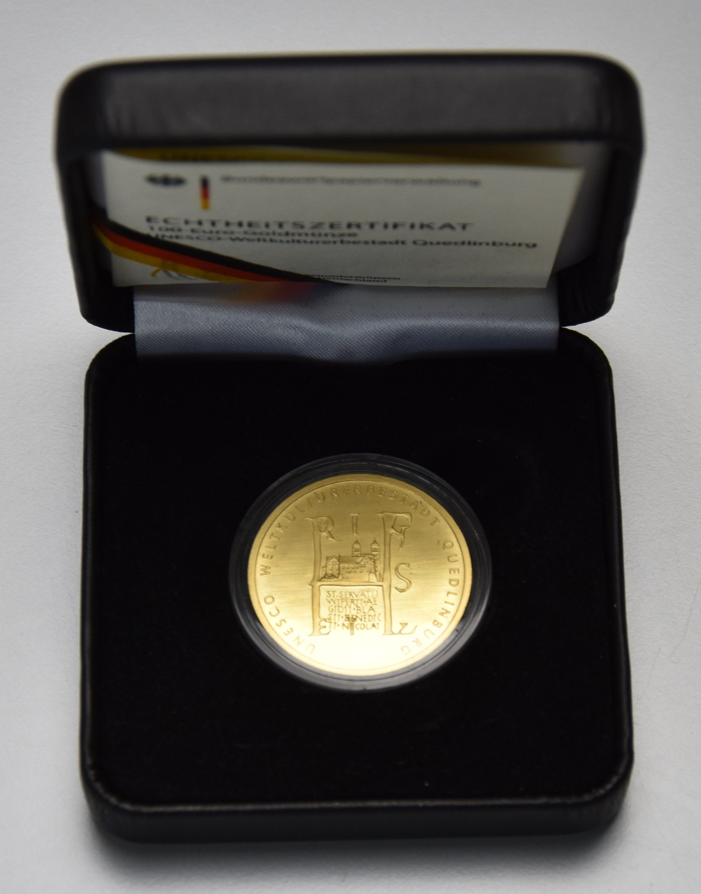 Die 100 Euro Goldmünze UNESCO-Weltkulturerbe Stadt Quedlinburg wird einzeln gekapselt in der Original Münzschatulle mit Echtheitszertifikat der Deutschen Bundesbank geliefert.