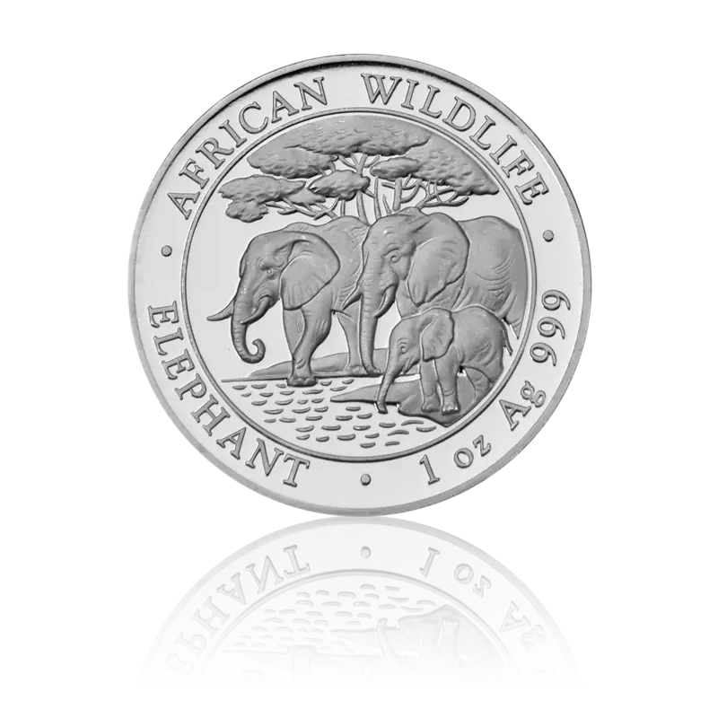 Die Anlagemünze African Wildlife – Somalia Elefant hat eine Feinheit von 999/1000. Die Ersterscheinung des Somalia Elefant war im Jahr 2004 und seither gewinnt er stark an Beliebtheit. Diesen Erfolg verdankt er vor allem seiner hohen Qualität und seinenm attraktiven Designs.