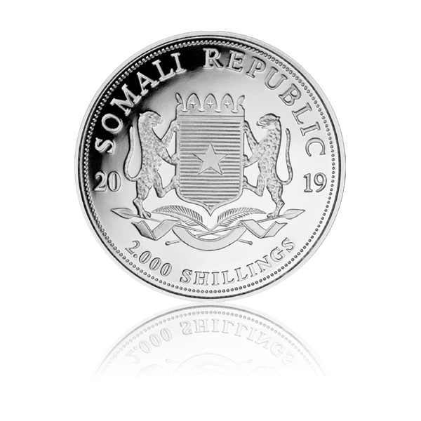 Die Ersterscheinung des Somalia Elefant war im Jahr 2004 und seither gewinnt er stark an Beliebtheit. Diesen Erfolg verdankt er vor allem seiner hohen Qualität und seinem attraktiven Designs. Durch das Tragen des Nennwertes von 2000 Somalischen Shilling ist der 1 kg Somalia Elefant ein offiziell zugelassenes Zahlungsmittel in der somalischen Republik. Auf der Rückseite erkennt man das Wappen der Demokratischen Republik Somalia, den Nennwert von 2000 Somalischen Shilling und das Prägejahr 2019. Auf der Vorderseite befindet sich das jährlich wechselnde Motiv zweier Elefanten, welchem die Münze ihre Beliebtheit und ihren beeindruckenden Charme verdankt. Um das Motiv der Elefanten befindet sich ein Rand, in welchen „African Wildlife – Elephant – 1kg Ag 999“ geprägt wurde.