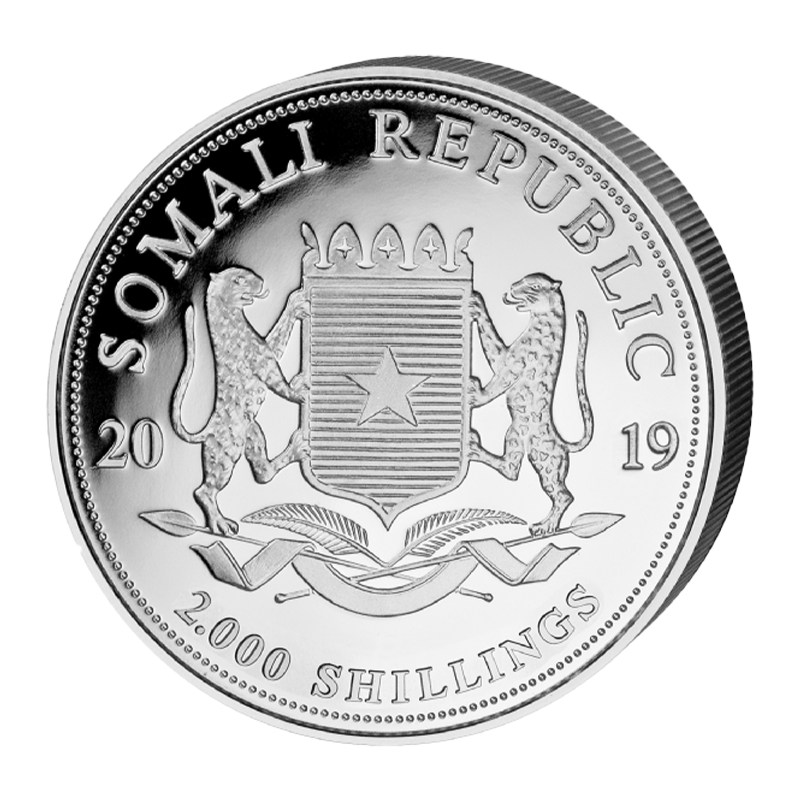 Die Ersterscheinung des Somalia Elefant war im Jahr 2004 und seither gewinnt er stark an Beliebtheit. Diesen Erfolg verdankt er vor allem seiner hohen Qualität und seinem attraktiven Designs. Durch das Tragen des Nennwertes von 2000 Somalischen Shilling ist der 1 kg Somalia Elefant ein offiziell zugelassenes Zahlungsmittel in der somalischen Republik. Auf der Rückseite erkennt man das Wappen der Demokratischen Republik Somalia, den Nennwert von 2000 Somalischen Shilling und das Prägejahr 2019. Auf der Vorderseite befindet sich das jährlich wechselnde Motiv zweier Elefanten, welchem die Münze ihre Beliebtheit und ihren beeindruckenden Charme verdankt. Um das Motiv der Elefanten befindet sich ein Rand, in welchen „African Wildlife – Elephant – 1kg Ag 999“ geprägt wurde.