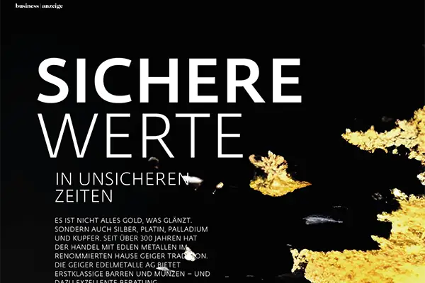 ES IST NICHT ALLES GOLD, WAS GLÄNZT. SONDERN AUCH SILBER, PLATIN, PALLADIUM UND KUPFER. SEIT ÜBER 300 JAHREN HAT DER HANDEL MIT EDLEN METALLEN IM RENOMMIERTEN HAUSE GEIGER TRADITION. DIE GEIGER EDELMETALLE AG BIETET ERSTKLASSIGE BARREN UND MÜNZEN – UND DAZU EXZELLENTE BERATUNG.