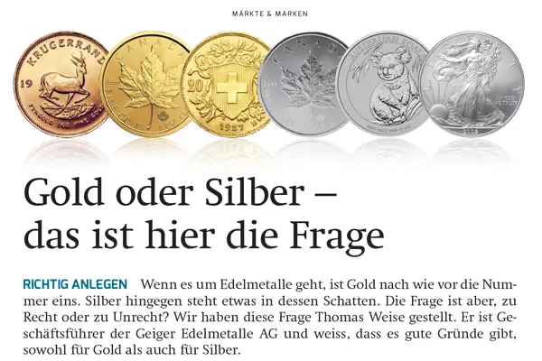 Wenn es um Edelmetalle geht, ist Gold nach wie vor die Nummer eins. Silber hingegen steht etwas in dessen Schatten. Die Frage ist aber, zu Recht oder zu Unrecht? Wir haben diese Frage Thomas Weise gestellt. Er ist Geschäftsführer der Geiger Edelmetalle AG und weiss, dass es gute Gründe gibt, sowohl für Gold als auch für Silber.