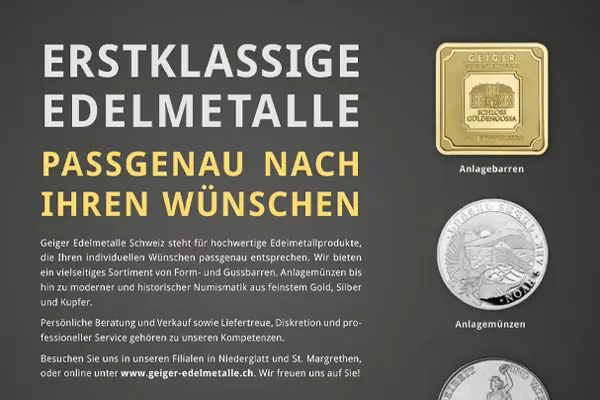 Geiger Edelmetalle Schweiz steht für hochwertige Edelmetallprodukte, die Ihren individuellen Wünschen passgenau entsprechen. Wir bieten ein vielseitiges Sortiment von Form- und Gussbarren, Anlagemünzen bis hin zu moderner und historischer Numismatik aus feinstem Gold, Silber und Kupfer.