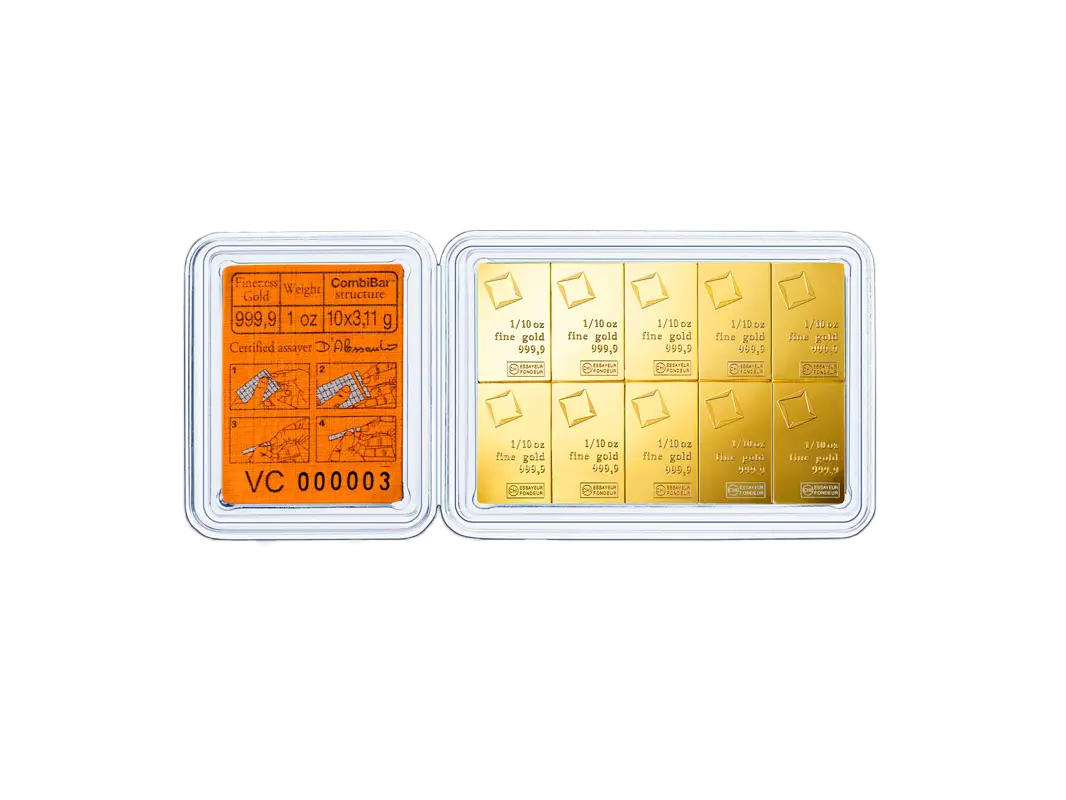 The 10 x 1/10 oz gold combibar is made of pure fine gold (999.9 / 1000).