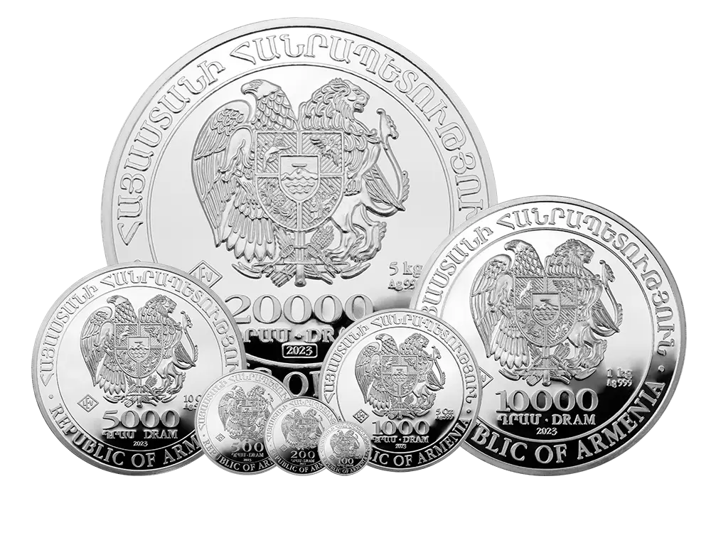 The obverse of the coin shows the Armenian coat of arms and the inscription “REPUBLIC OF ARMENIA”. Below is the face value in drams, as drams are the official Armenian currency. The fine weight information (1/4 oz, 1/2 oz, 1 oz etc.) is stated on the coin. The year of issue is also discreetly shown below the face value.