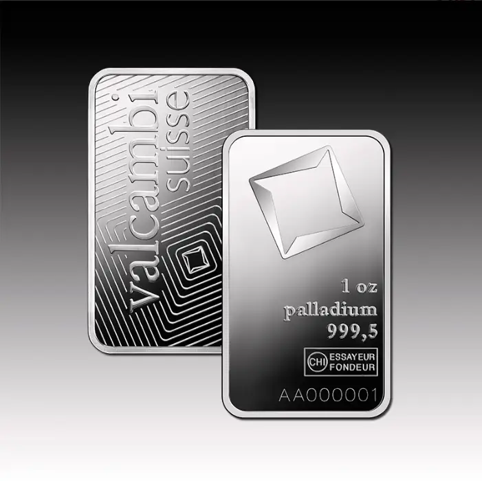 These 1 oz palladium bars are produced by Valcambi in Switzerland. They are graded to the Good Delivery Standard of the LPPM and are traded internationally.