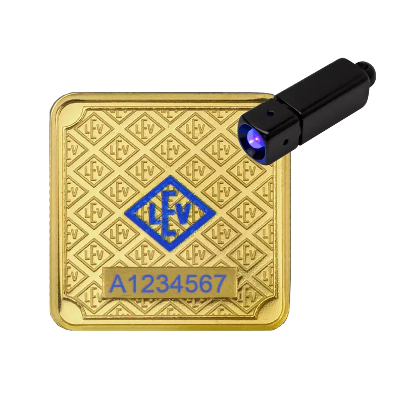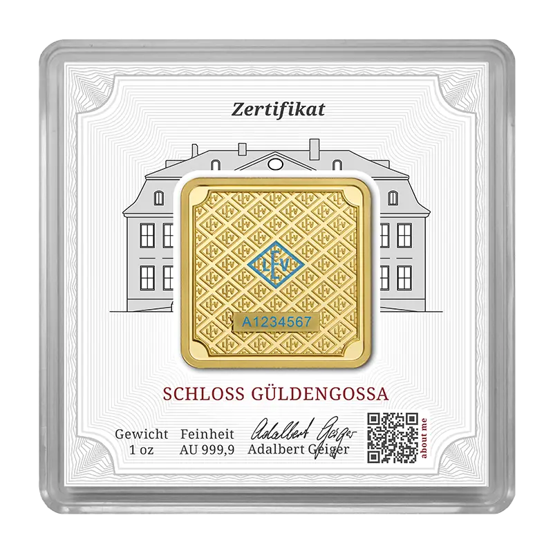 31,1 Gramm feinstes Gold sind in diesem Barren verarbeitet. Zusätzlich glänzt der Barren mit einer sog. pearl-finish Oberfläche und hohem geprägten Relief. Die Rückseite ist strukturiert mit dem Prägezeichen unserer Herstellerfirma der Leipziger Edelmetallverarbeitung (kurz LEV), was als Muster angeordnet ist. Der Prägebarren trägt einen besonderen, geriffelten Rand, welcher sonst nur bei Münzen üblich ist. Weiterhin hat der Barren eine blaue Sicherheitsbeschichtung auf der Rückseite, welches eine individuelle Seriennummer umfasst und das LEV-Prägezeichen. Unter UV-Beleuchtung fluoresziert diese Beschichtung.