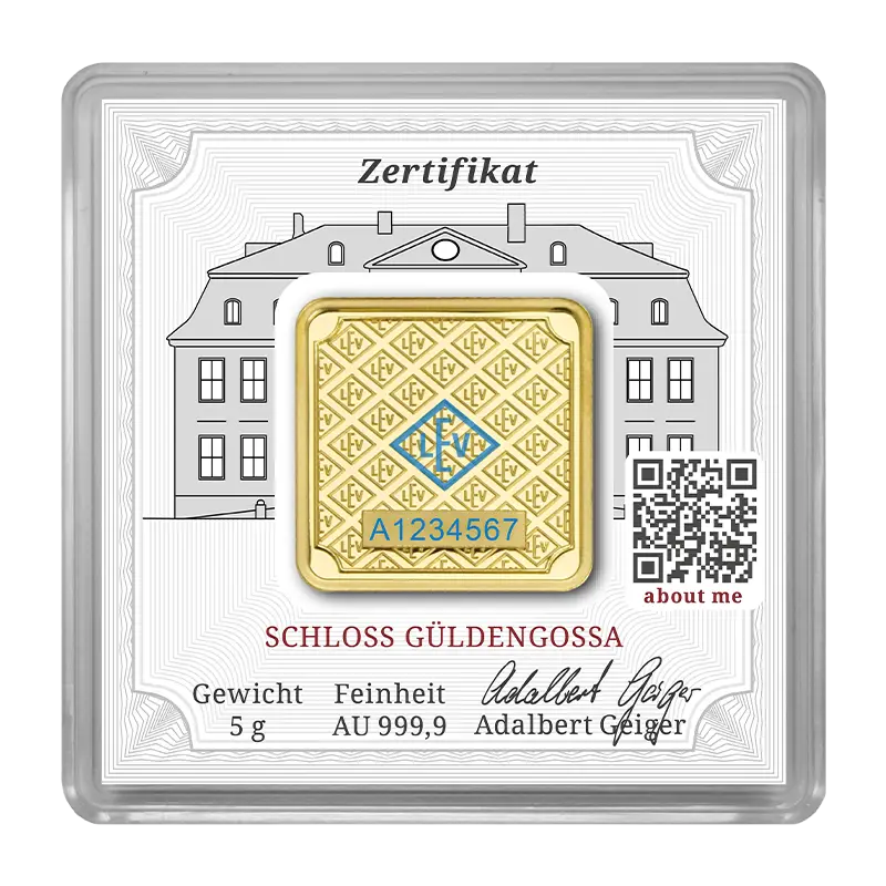 Die Vorderseite der Barren zeigt außerdem das Geiger Edelmetalle Logo, das schöne Schloss Güldengossa (eingetragenes Markenzeichen) und die Angaben zu Gewicht und Feinheit des Goldes.