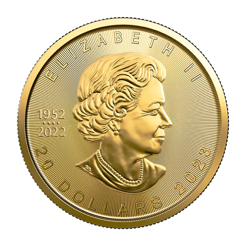 Die kanadische Münze "Maple Leaf" wird in Gold seit 1979 von der Royal Canadian Mint geprägt. Die Anlagemünze in Stempelglanz hat eine Feinheit von 999,9/1000 (1979-1982 99,9/1000) Auf der Wertseite ist das Portrait von Königin Elisabeth II oder Charels III (ab 2023) abgebildet.