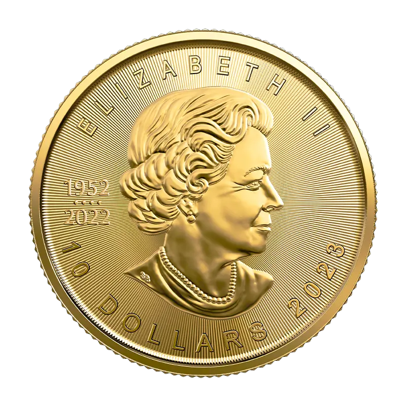 Die kanadische Münze "Maple Leaf" wird in Gold seit 1979 von der Royal Canadian Mint geprägt. Die Anlagemünze hat eine Feinheit von 999,9/1000 (1979-1982 99,9/1000) Auf der Wertseite ist das Portrait von Königin Elisabeth II oder Charels III (ab 2023) abgebildet.