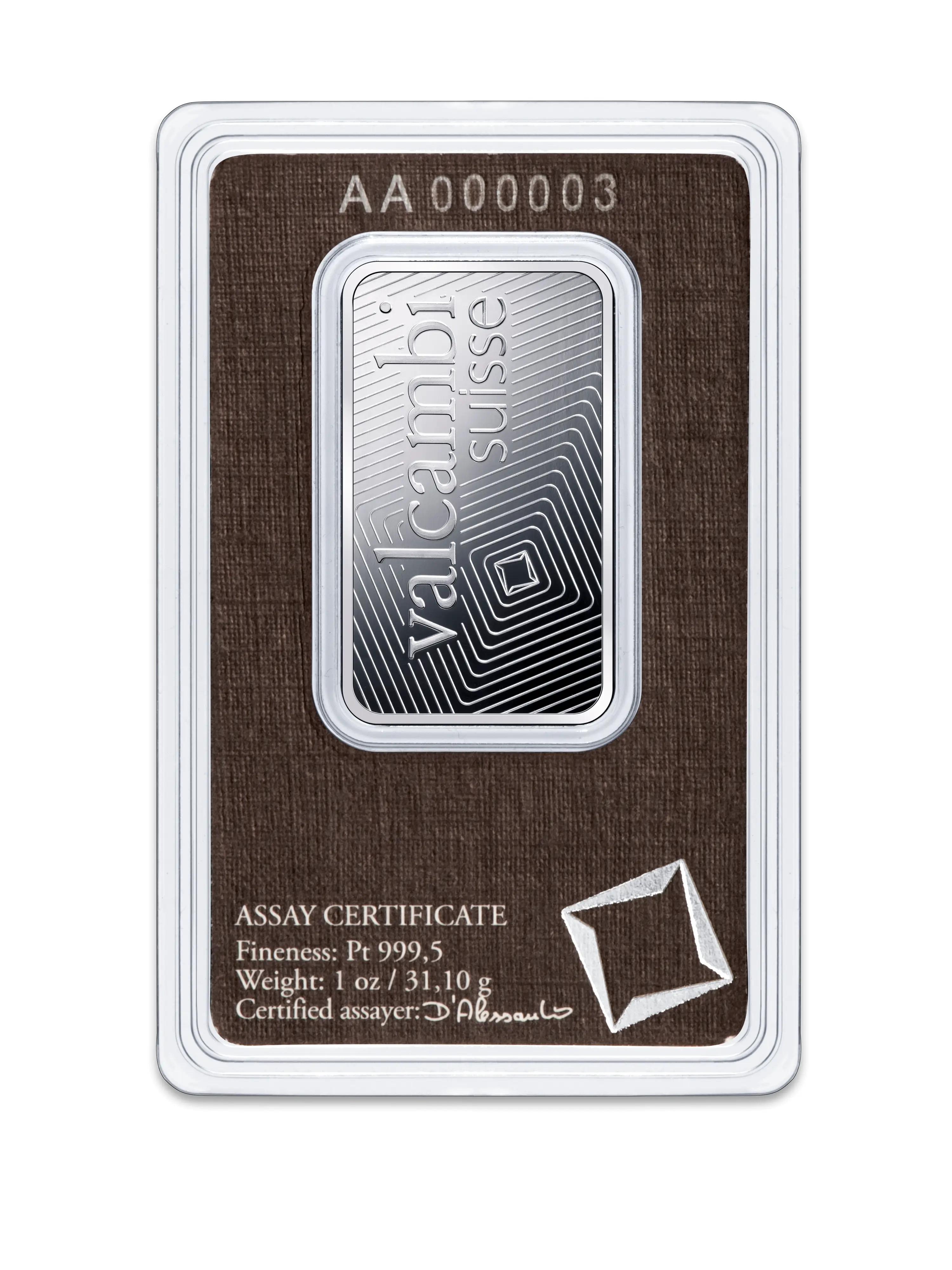 Bei diesem Paltinbarren handelt es sich um ein Produkt, welches ausschließlich vom LBMA-zertifizierten Hersteller Valcambi produziert wurde. Die Goldbarren tragen das Logo von Valcambi. Diese Barren sind einzeln, meist in Blisterkarten bis inkl. des 100g Barren, verschweißt.