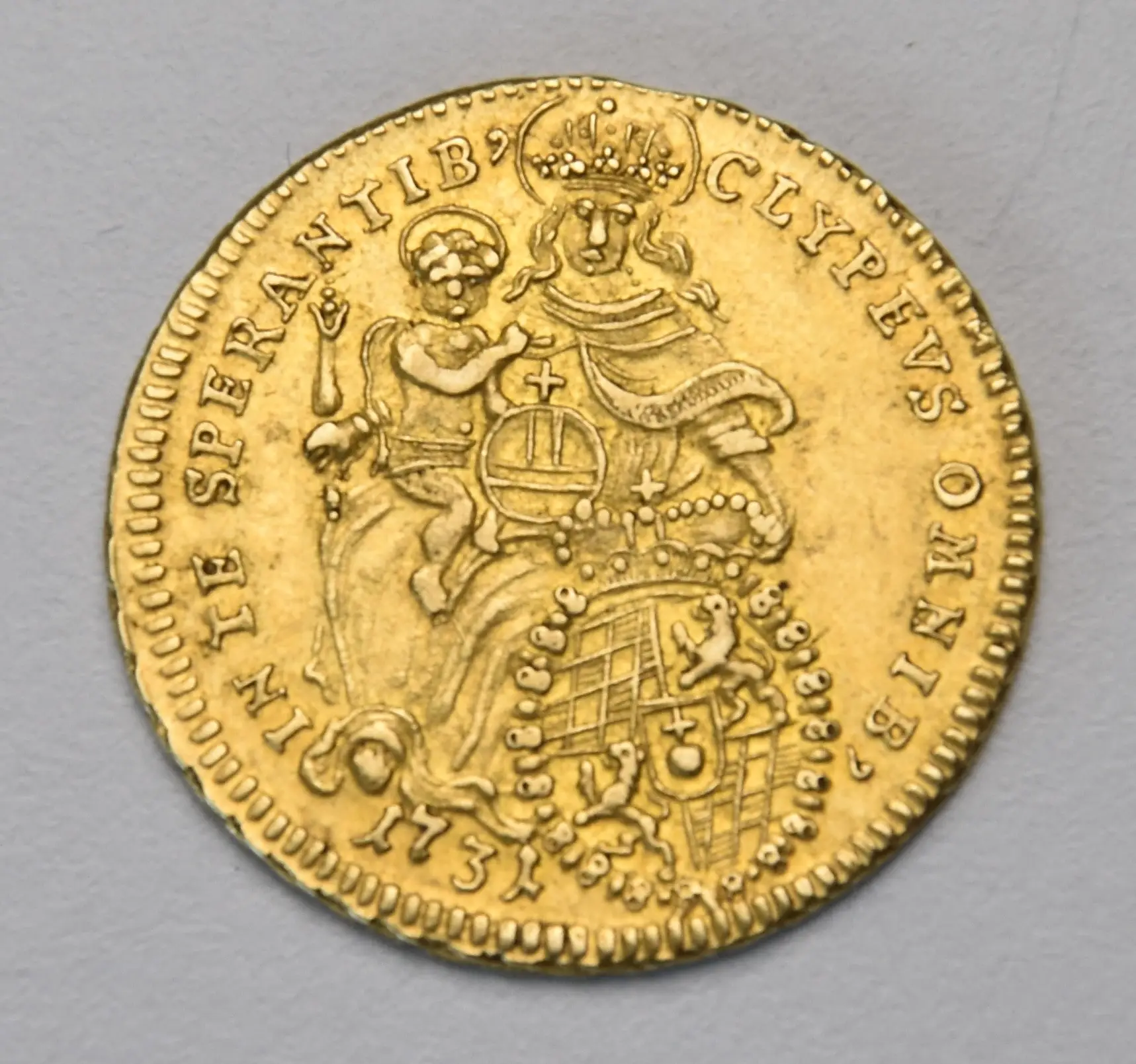 Wertseite: Thronende Madonna mit Kind und dem kurfürstlichen Wappenschild (IN TE SPERANTIB CLYPEVS OMNIB / bedeutet "Du bist ein Schutzschild für alle, die auf dich hoffen")