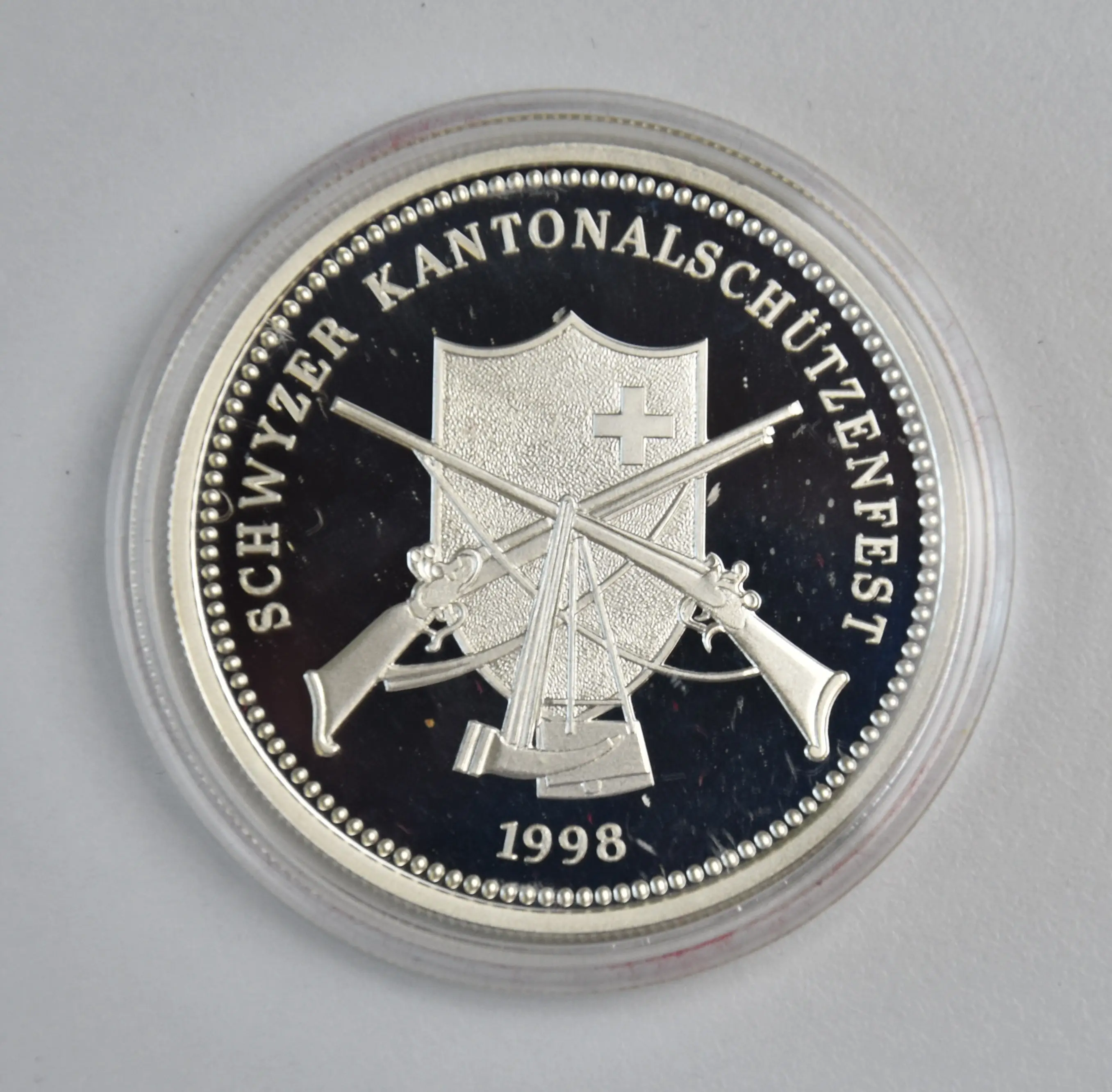 Schweiz Schwyzer Kantonalschützenfest SchwyzNominal: 50 Franken Jahr: 1998Auflage: 1500 Stück Erhaltung: Polierte Platte.Bru…