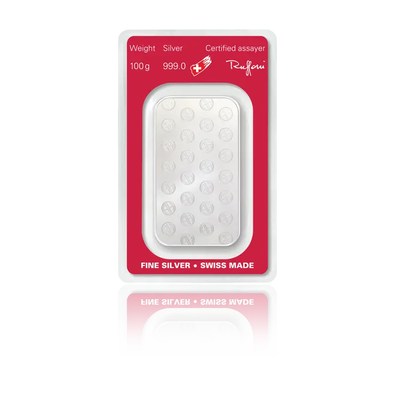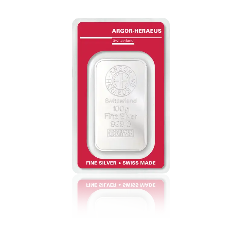 Silberbarren kaufen ist die klassische Form der Geldanlage in Edelmetall und sie sollten in keinem Edelmetallportfolio fehlen. Wir bieten Ihnen mit diesen Silberbarren nur Produkte von Produzenten, die nach dem Good-Delivery Standard der LBMA zertifiziert sind. Wir verkaufen hier meist Barren der Firma Argor-Heraeus, jedoch können es auch Barren der Firmen Degussa, Umicore, Banken wie ZKB, UBS o.a. sein. Auf den 100 g Silberbarren finden Sie Angaben zum Hersteller, die Art des Edelmetalls (Feinsilber), die Feinheit von 999/1000 und das Gewicht von 100 g.