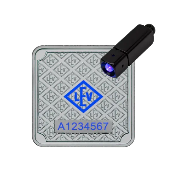 Die Rückseite der Barren trägt ein als Muster angeordnetes Netz aus der Wiederholung des Prägezeichens unserer Herstellerfirma. Außerdem trägt die Rückseite eine blaue Beschichtung mit einer individuellen Seriennummer und einem mittig platzierten Prägezeichens. Diese blaue Beschichtung hat die Besonderheit, dass sie unter UV-Licht fluoresziert.