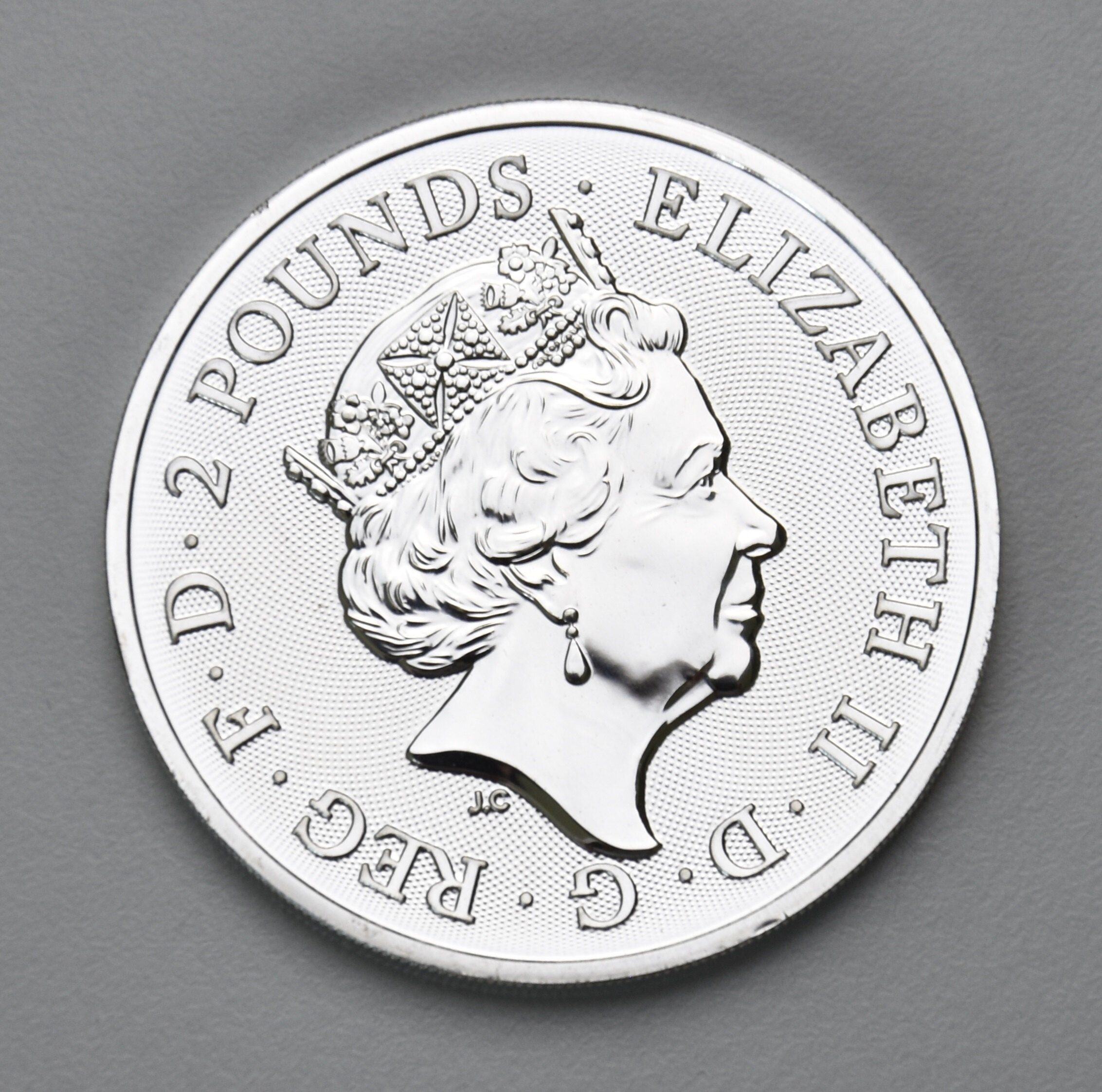 Die Silbermünze aus der Royal Mint zeigt das Wappen Royal Arms, ein Symbol der Stärke und der illustren Geschichte der Monarchie und der Heraldik im Vereinigten Königreich.