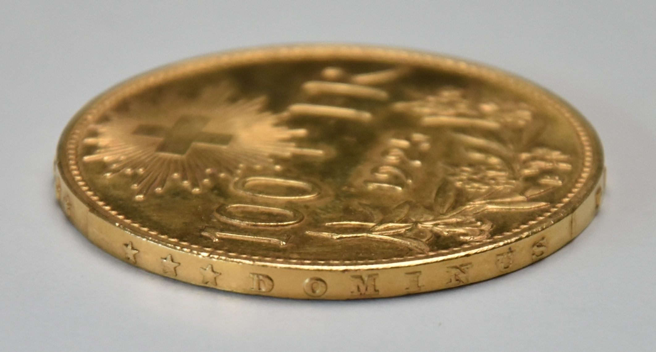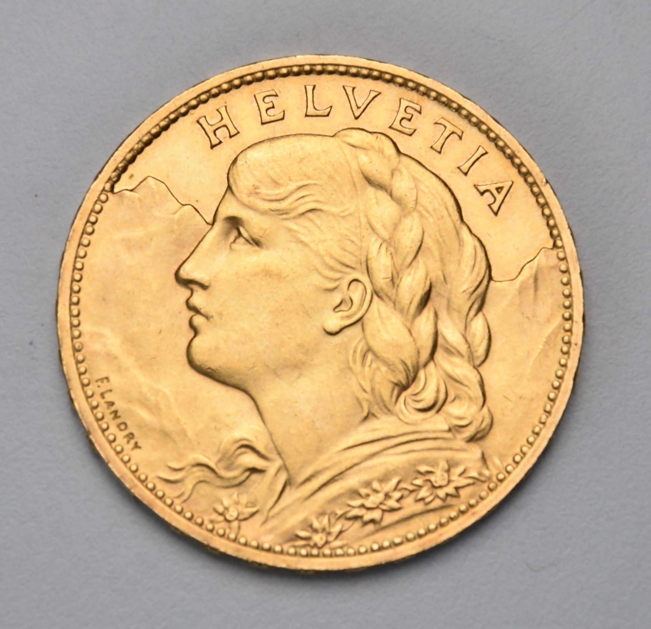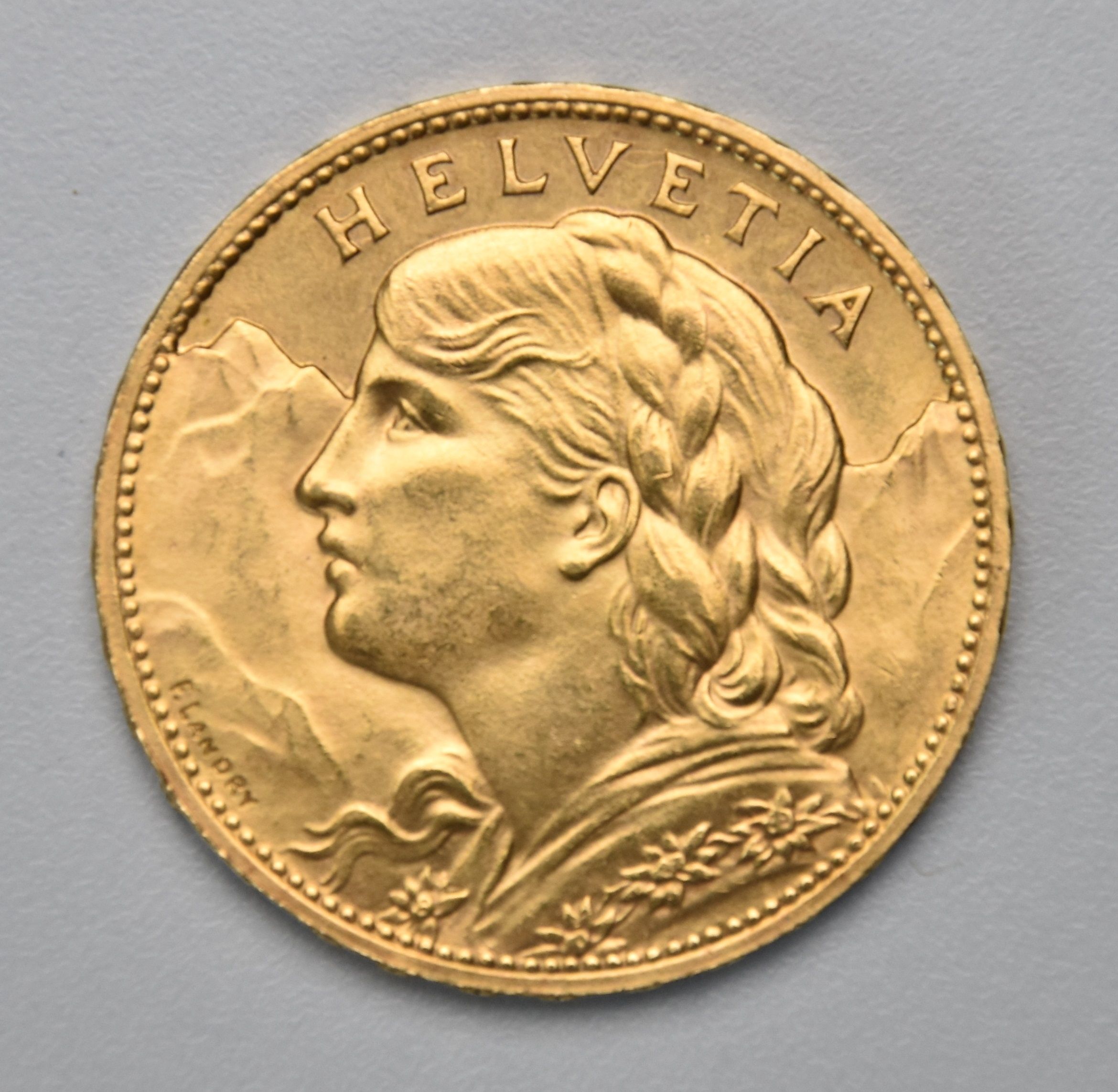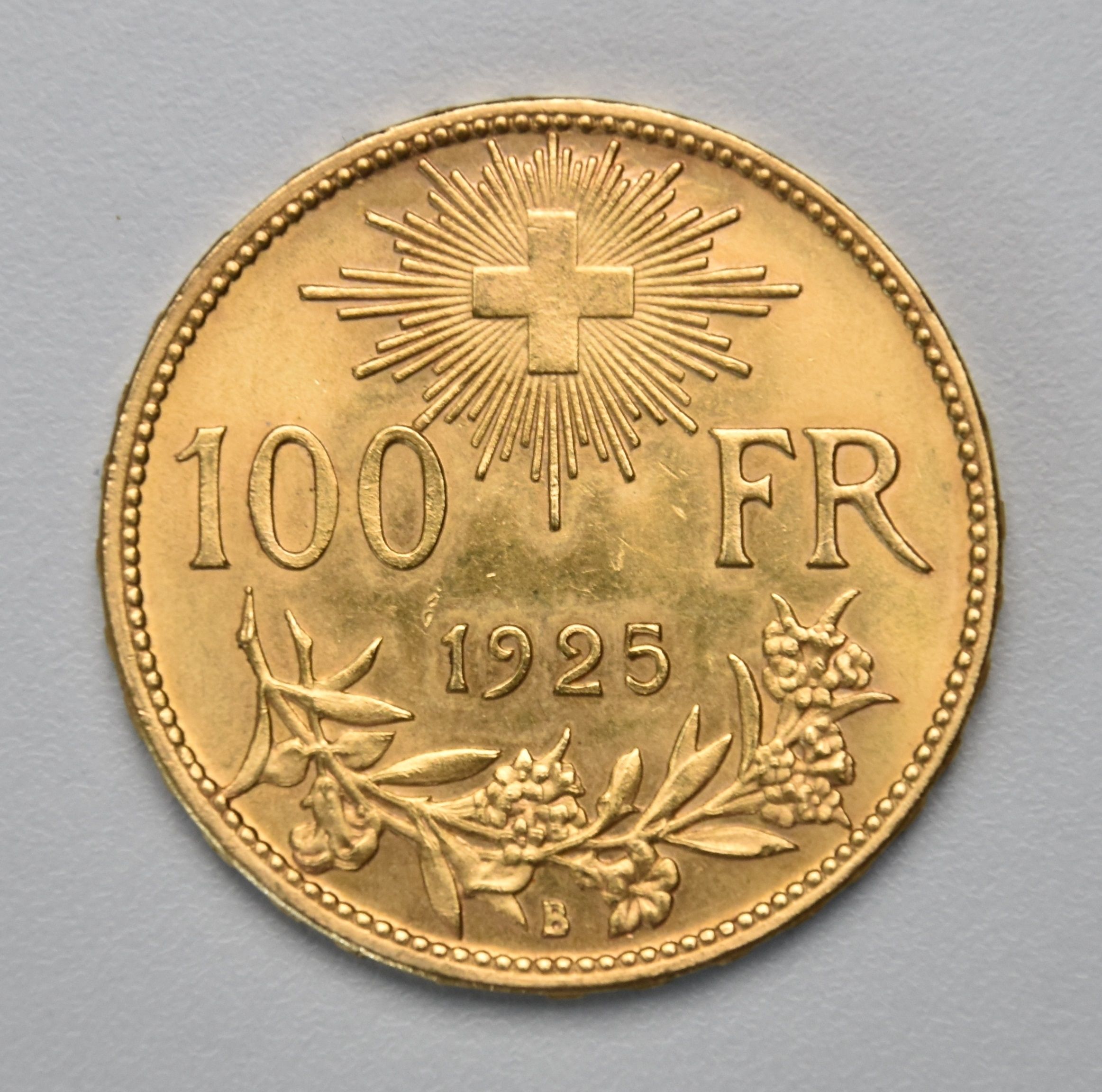Die 100 Franken Goldmünze von 1925 war die grösste Goldmünze, die während der Zeit der Eidgenossenschaft (1848 bis heute) geprägt wurde und entspricht dem von fünf 20 Franken Vreneli.