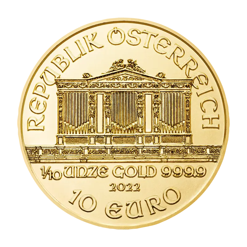 Obwohl er auch außerhalb der Europäischen Union eine große Fangemeinde hat, ist er durch seinen Nennwert von 10 EURO besonders bei europäischen Anlegern gefragt. Doch diesen Wert trägt der Wiener erst seit der Euroeinführung 2002, denn zuvor trug er einen Nennwert in Höhe von 200 Schilling. Auch die Nähe der Prägestätte ist ein Plus für den Philharmoniker. Die kurzen Transportwege und die Tatsache, dass die Münze Österreich auch eine eigene Scheideanstalt unterhält, sorgen für ausreichende und schnelle Lieferungen. Der Wiener Philharmoniker verdankt seinen Namen dem bekannten österreichischen Orchester, welches zu den Besten der Welt zählt. Die Goldmünze zeigt auf der Vorderseite die große Orgel des Wiener Musikvereins. Unterhalb der Orgel sind das Gewicht von 1/10 oz, die Feinheit 999,9, das Prägejahr und der Nennwert in Höhe von 10 EURO eingeprägt. Darüber können Sie den eingeprägten Schriftzug REPUPLIK ÖSTERREICH erkennen. Auf der Rückseite sind einige Musikinstrumente der Philharmoniker abgebildet und am oberen Rand befindet sich der Name des Orchesters und der Goldmünze, WIENER PHILHAMRONIKER.