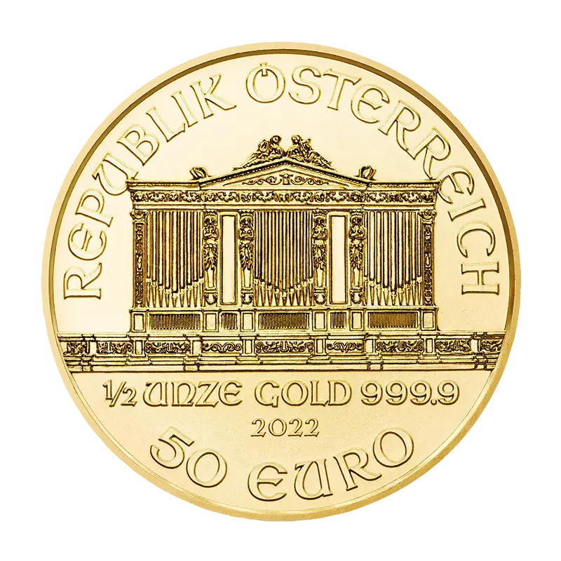 Seine rasch ansteigende Beliebtheit verdankt er vor allem dem Umstand, dass der Philharmoniker die erste europäische Goldmünze mit einem Feingehalt von 999,9/1000 besitzt. Obwohl er auch außerhalb der Europäischen Union eine große Fangemeinde hat ist er durch seinen Nennwert von 50 EURO besonders bei europäischen Anlegern gefragt. Doch diesen Wert trägt der „Wiener“ erst seit der Euroeinführung 2002, denn zuvor trug er einen Nennwert in Höhe von 1000 Schilling. Auch die Nähe der Prägestätte ist ein Plus für den Philharmoniker. Die kurzen Transportwege und die Tatsache, dass die Münze Österreich auch eine eigene Scheideanstalt unterhält, sorgen für ausreichende und schnelle Lieferungen. Der Wiener Philharmoniker verdankt seinen Namen dem bekannten österreichischen Orchester, welches zu den Besten der Welt zählt. Die Goldmünze zeigt auf der Vorderseite die große Orgel des Wiener Musikvereins. Unterhalb der Orgel sind das Gewicht von 1/2oz, die Feinheit 999,9, das Prägejahr und der Nennwert in Höhe von 50 EURO eingeprägt. Darüber können Sie den eingeprägten Schriftzug „REPUPLIK ÖSTERREICH“ erkennen. Auf der Rückseite sind einige Musikinstrumente der Philharmoniker abgebildet und am oberen Rand befindet sich der Name des Orchesters und der Goldmünze, „WIENER PHILHAMRONIKER“.