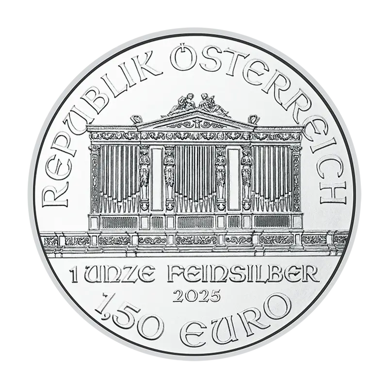 Obwohl die Münze erst im Jahr 2008 ihre Anfänge hat, stand sie schon früh auf einer Stufe mit dem Maple Leaf und dem Silver Eagle und ist heute im Edelmetallhandel fest verankert. Der Philharmoniker wird in Silber nur in der Größe von 1 Unze herausgegeben und zu je 20 Stück in einem Tube verpackt. Die Vorderseite zeigt die berühmte Orgel aus dem goldenen Saal des Wiener Musikvereins. Darüber ist das Ausgabeland, die Republik Österreich, eingeprägt, während darunter das Gewicht, das Material, das Prägejahr und der Nominalwert angegeben sind. Unter der Inschrift WIENER PHILHARMONIKER SILBER, ziert eine Auswahl an Instrumenten der Philharmoniker die Rückseite.